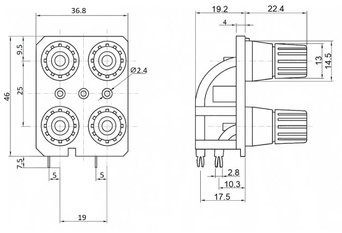 Terminal/gniazdo typu bananowego o średnicy 4 mm, stosowany jako złącze audio do wzmacniaczy, głośników lub innych urządzeń dźwiękowych. Jego konstrukcja umożliwia podłączenie przewodów w formie “gołego drutu”, wtyków bananowych lub widełek.