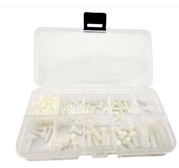Praktyczny komplet śrubek, nakrętek i podkładek z tworzywa sztucznego w popularnych rozmiarach M2, M2.5, M3, M4 oraz M5. Elementy wykonane są z lekkiego i odpornego materiału, co zapewnia izolacyjność elektryczną i odporność na korozję.